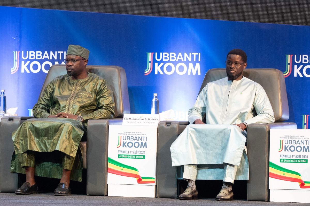Senegalese Prime Minister Ousmane Sonko (L) and Senegalese President Bassirou Diomaye Faye (R) attend the opening of the official ceremony of the presentation of the economic and social recovery plan by the head of government at the Grand Theatre in Dakar on August 1, 2025. (Photo by SEYLLOU / AFP)