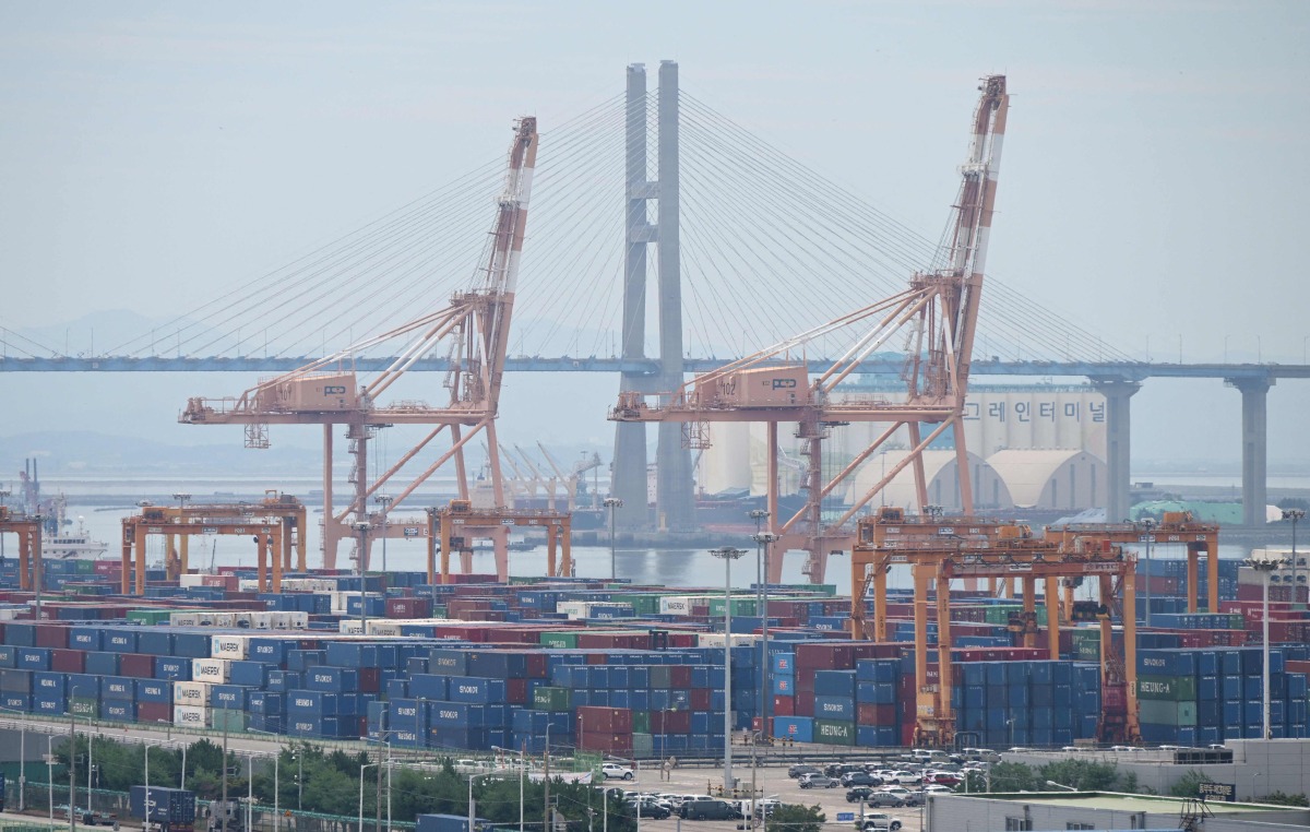 Cranes and shipping containers are seen at a port in Pyeongtaek, South Korea on July 31, 2025. Photo by Shin Yong-ju / AFP
