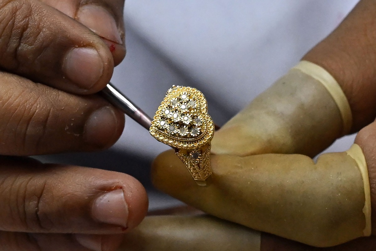 In this photograph taken on April 9, 2025, an employee applies lacquer on a wedding ring for rhodium plating at the manufacturing unit of Creations Gems & Jewellery Pvt. Ltd., in Mumbai. Photo by Indranil MUKHERJEE / AFP