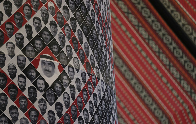The mural is located in two areas inside the stadium, first one at the entrance for the players and the second mural on the upper floors that can be seen from the stands. Below the mural, which has photos of all the workers, there is a banner that has thank you written in different languages of the workers.