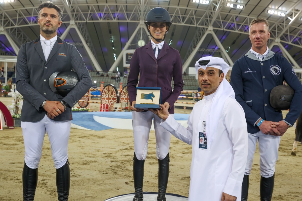 Omar Al Mannai, Event Director at Al Shaqab, presents the award to CSI5* against the clock 1.55m winner Ioli Mytilineou of Greece. Turkey’s Efe Siyahi (left) finished second, while the Netherlands’ Jur Vrieling was third.