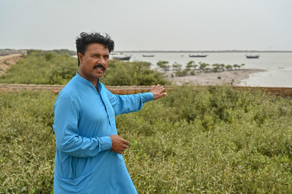 Muhammad Saleem, a local leader, speaks with AFP while showing newly planted mangroves in Keti Bandar town of Thatta district. (Photo by Asif Hassan / AFP)