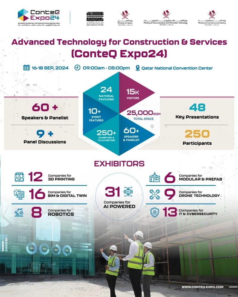 ConteQ Expo 2024 is the first event of its kind in Qatar showcasing cutting-edge technologies such as 3D printing, robotics, drones, and artificial intelligence that are transforming the construction and services sectors. The innovative exhibition is a result of collaborative efforts of 4 esteemed Qatari governmental entities: The Ministry of Commerce & Industry (MOCI), the Ministry of Communication and Information Technology (MCIT), the Ministry of Labour (MOL), and the Public Works Authority 'Ashghal’.