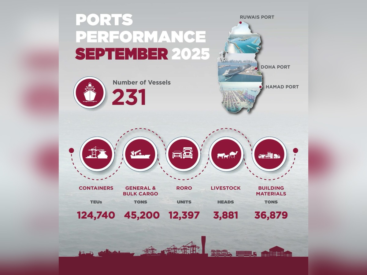 Mwani Qatar stated in post on its X account, yesterday “Qatar port’s handled 124,740 twenty-foot equivalent units (TEUs) in September 2025, marking a 12 percent increase in transshipment compared to last month. RORO handling rose by approximately 34 percent compared to August 2025, while the total tonnage of general and bulk cargo exceeded 45,000 tons.