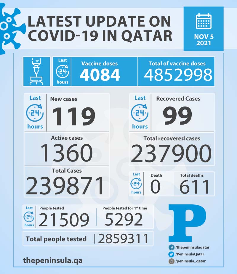 Doha: Ministry of Public Health (MoPH) today recorded 119 new cases of coronavirus (COVID-19) and 99 people recovered from the virus in the last 24 hours, bringing the total number of people recovered in Qatar to 237,900.