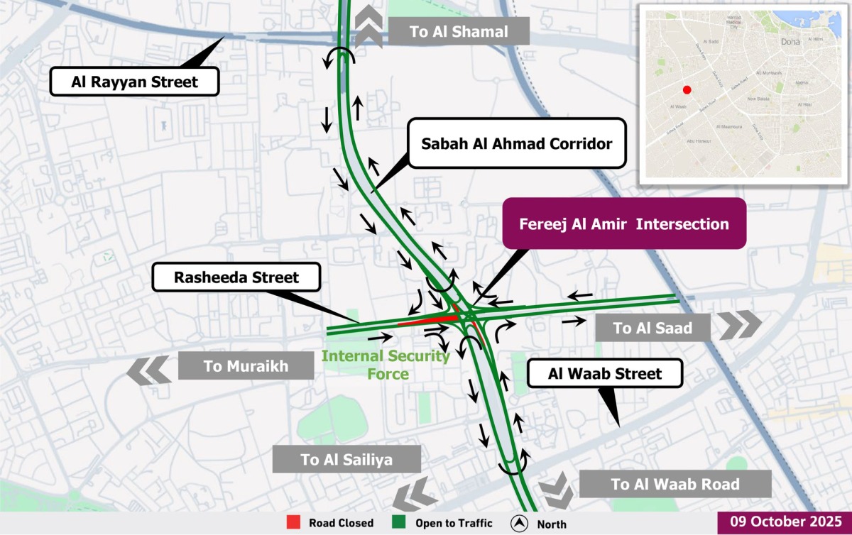 Another temporary partial closure will be implemented at Fereej Al Ameer Intersection on Sabah Al Ahmad Corridor affecting left-turn lane toward Al Shamal for traffic coming from Muraikh, and the left-turn lane toward Muraikh for traffic coming from Al Waab.