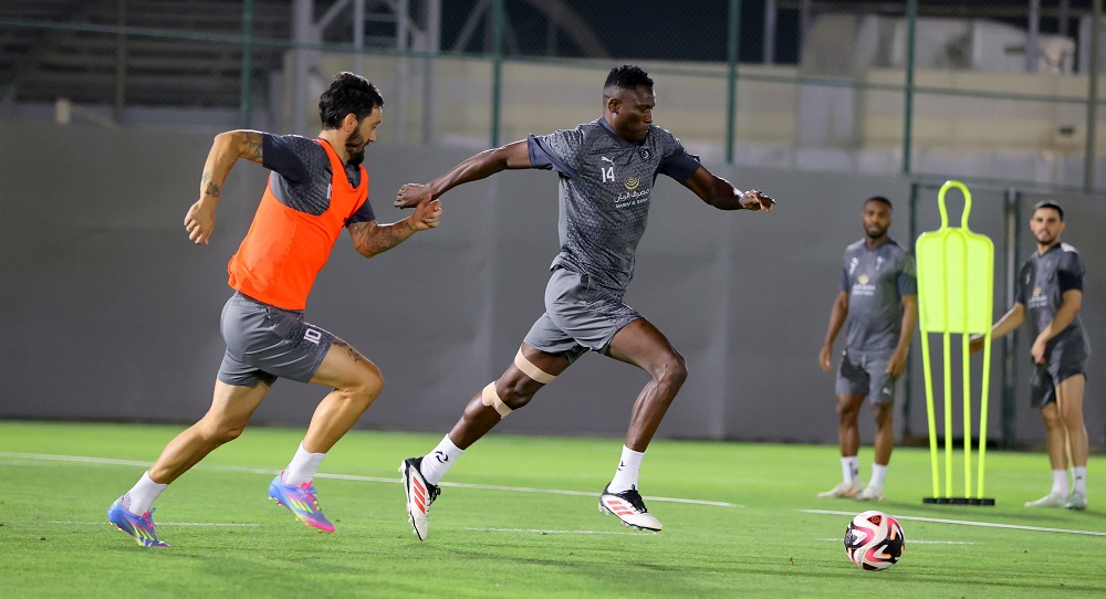 Al Duhail's Michael Olunga (right) attends a training session with a teammate yesterday.