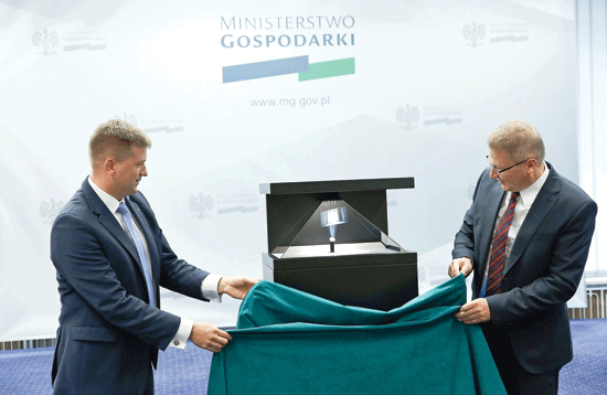 Polish Vice-Minister of Economy Arkadiusz Bak (left) and chairman of Digital Core Design company Jacek Hanke unveil the first Polish 32-bit microprocessor named D32PRO at the Ministry of Economy in Warsaw yesterday. The CPU was produced by Digital Core Design company from Bytom in southern Poland. The creators of the D32PRO microprocessor claim that it is the fastest CPU of its kind in the world.