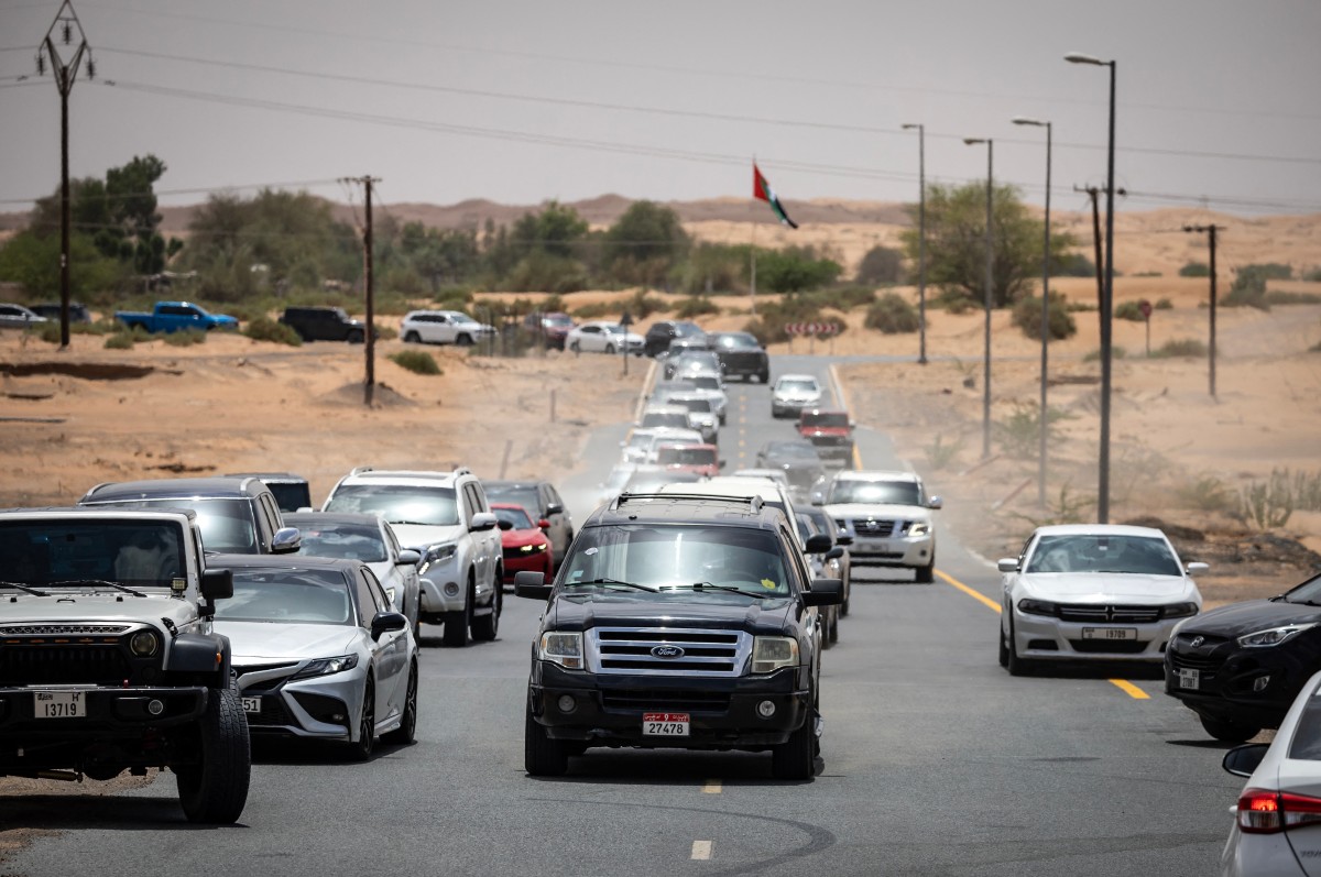 A convoy of cars led by Muhammed Sajjad drives as they "chase the rain" in the emirate of Sharjah on June 7, 2025. (Photo by Fadel Senna / AFP)