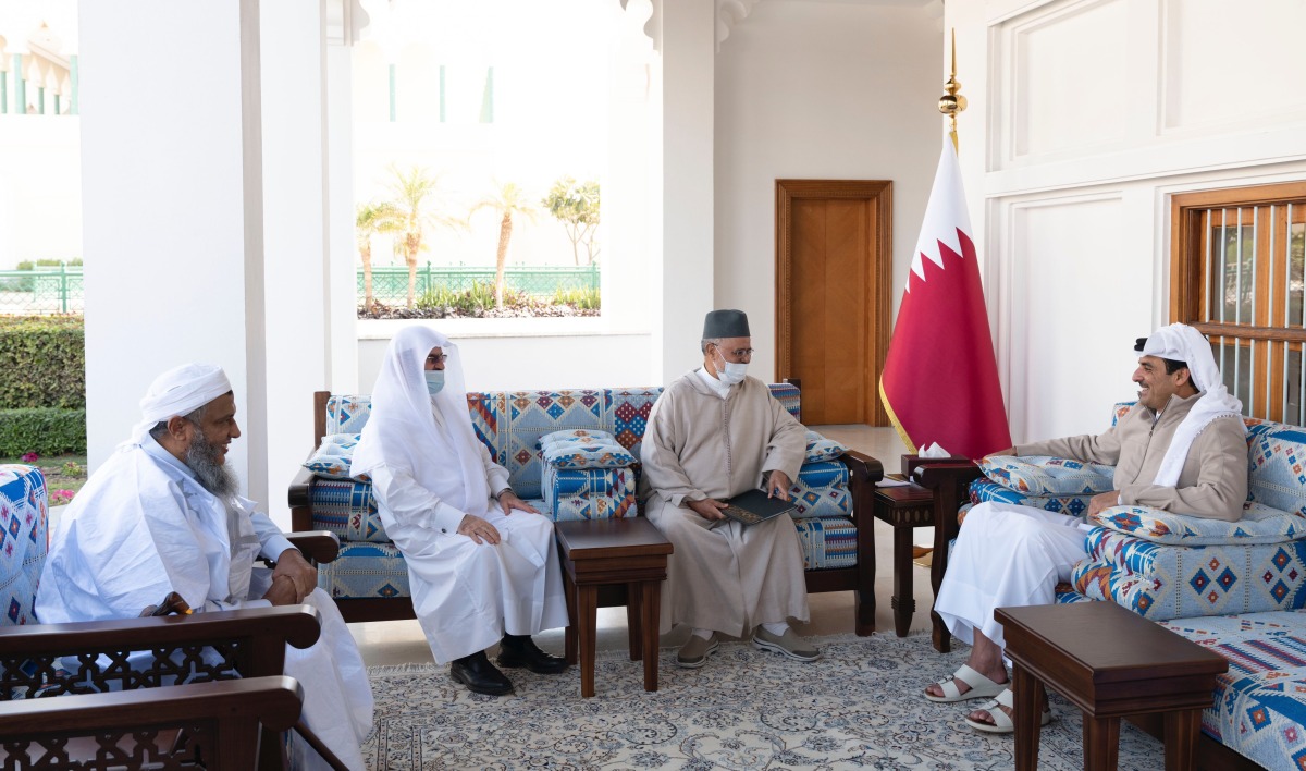 Doha: The Amir H H Sheikh Tamim bin Hamad Al Thani met President of the International Union of Muslim Scholars HE Dr. Ahmed Al-Raissouni and the accompanying delegation at Sheikh Abdullah bin Jassim Majlis at the Amiri Diwan today morning, February 13, 2022.
