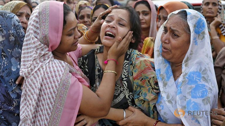 The chief minister of Madhya Pradesh state arrived at the scene on Sunday where his convoy was blocked by angry locals waving black flags, the Times of India reported.