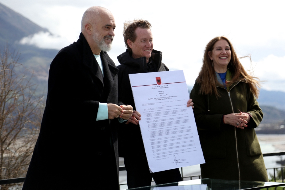 Albanian Prime Minister Edi Rama (left), Patagonia CEO Ryan Gellert and Albanian Minister of Tourism and Environment Mirela Kumbaro, pose during a signing ceremony, in the city of Tepelenene on March 14, 2023. (Photo by ADNAN BECI / AFP)
