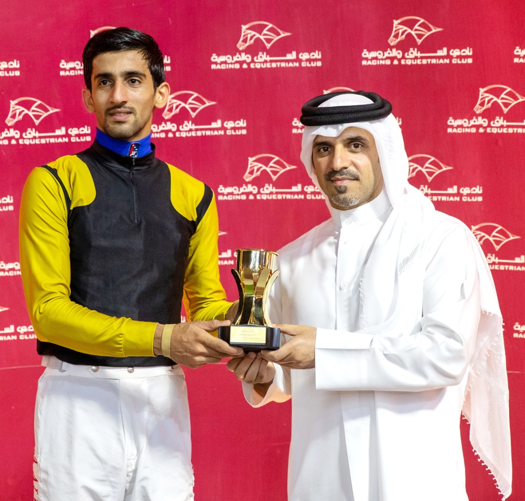 QREC Acting CEO Bader Mohamed Al Darwish presents the trophy to jockey Abdul Aziz Fahad Al Balushi.