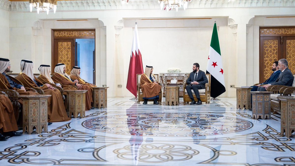 Damascus: Prime Minister and Minister of Foreign Affairs HE Sheikh Mohammed bin Abdulrahman bin Jassim Al Thani met with the leader of the new administration in Syria, HE Ahmed Al Sharaa, at Al Shaab Palace in Damascus today, January 16.