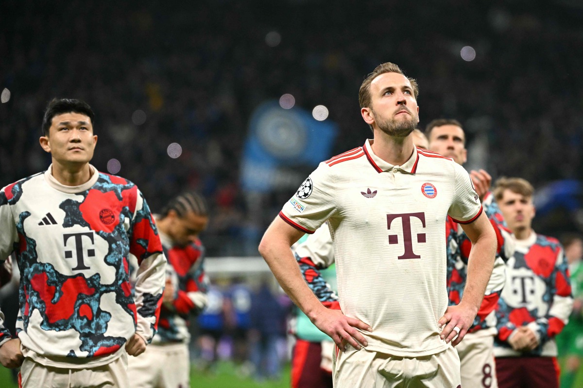 Bayern Munich's South Korean defender #03 Kim Min-Jae (L) and Bayern Munich's English forward #09 Harry Kane react at the end of the UEFA Champions League quarter final second leg football match between Inter Milan and Bayern Munich at the San Siro stadium in Milan on April 16, 2025. (Photo by Alberto PIZZOLI / AFP)