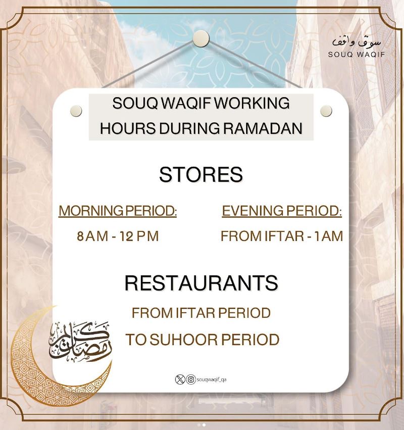 Meanwhile, stores in Souq Waqif will open from 8 am to 12 pm in the morning, and from Iftar time to 1 am for the evening period.