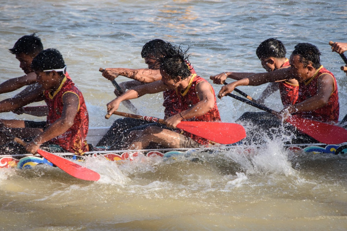Participants paddle hard on their boat during the Pacu Jalur longboat race festival on the Kuantan River in Kuantan Singingi Regency, Riau Province, on August 22, 2025. Photo by Wahyudi / AFP