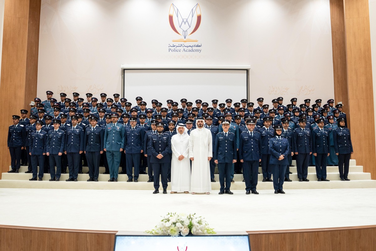 H E the Minister of Interior and H E Sheikh Abdullah bin Nasser bin Khalifa Al-Thani with the graduates during the ceremony.