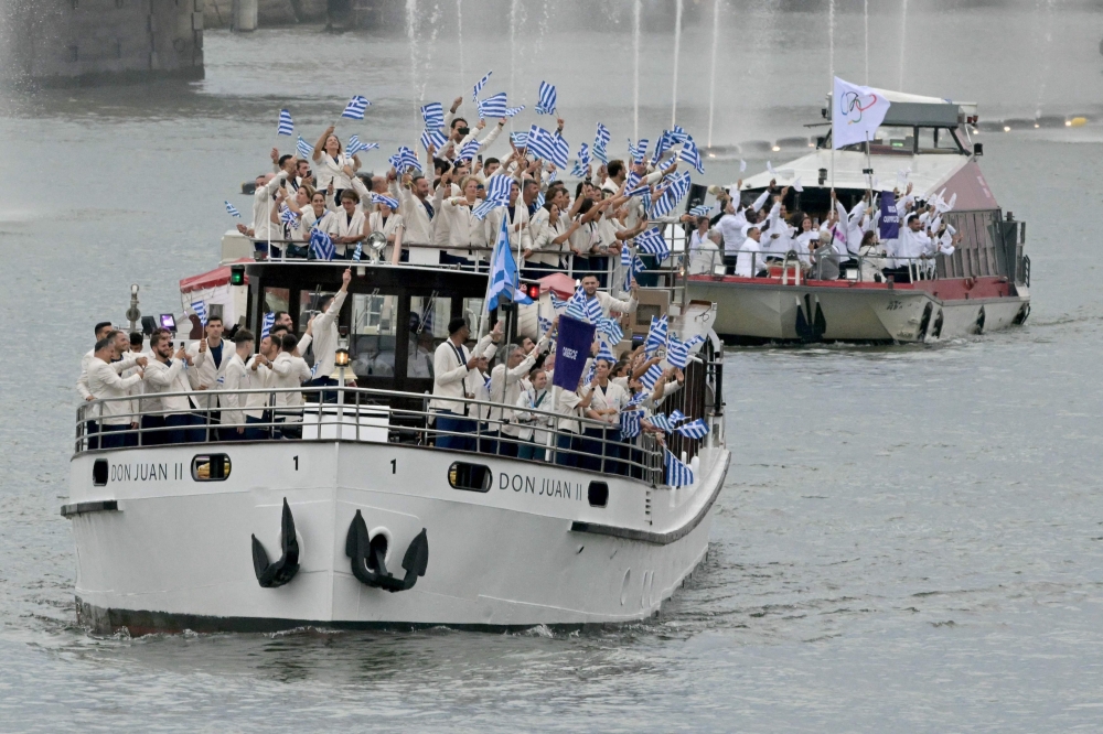 The delegation from Greece sails on a boat in front of a boat with the Refugee Olympic Team's delegation during the opening ceremony of the Paris 2024 Olympic Games in Paris on July 26, 2024. (Photo by Damien Meyer / AFP)