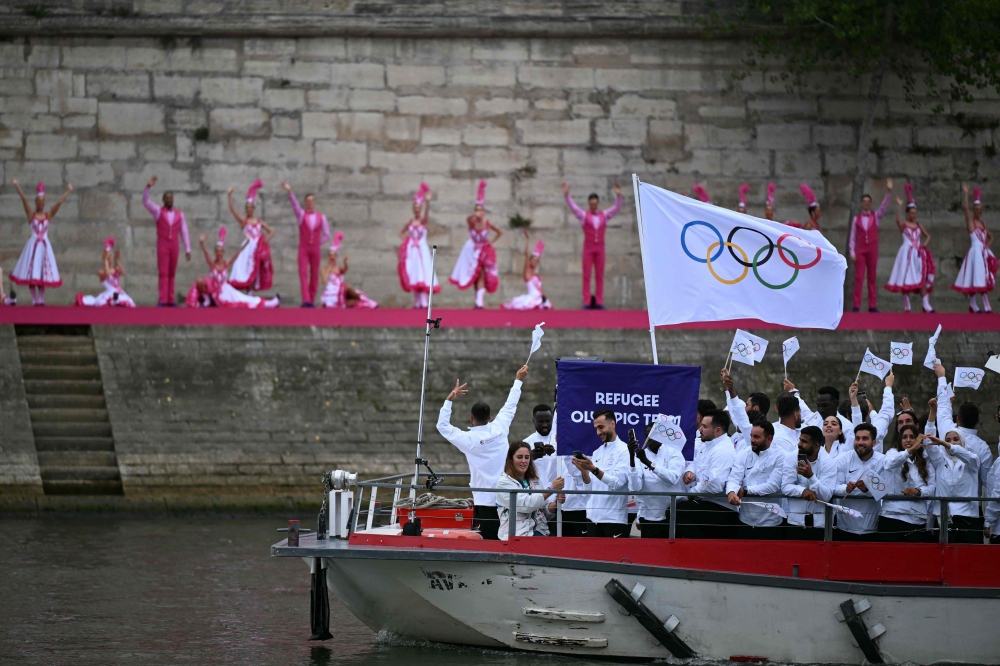 Athletes from Refugee Olympic Team's delegation sail in a boat along the river Seine at the start of the opening ceremony of the Paris 2024 Olympic Games in Paris on July 26, 2024. (Photo by Patricia De Melo Moreira / AFP)