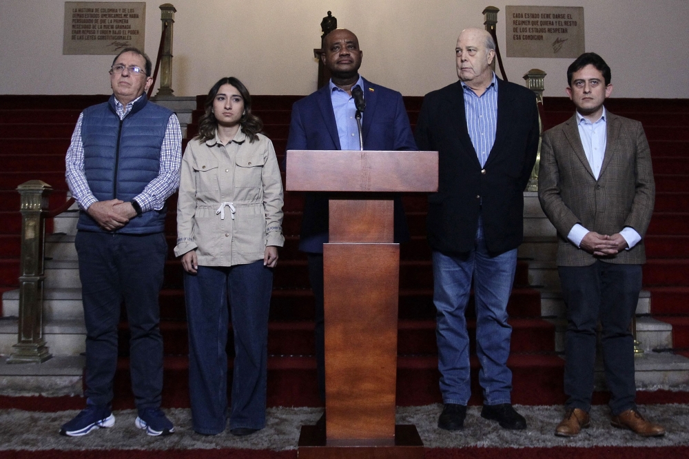 Colombian Foreign Relations Minister Luis Gilberto Murillo (C) speaks during a press conference at the San Carlos Palace in Bogota on January 26, 2025. (Photo by Andrea Ariza / AFP)