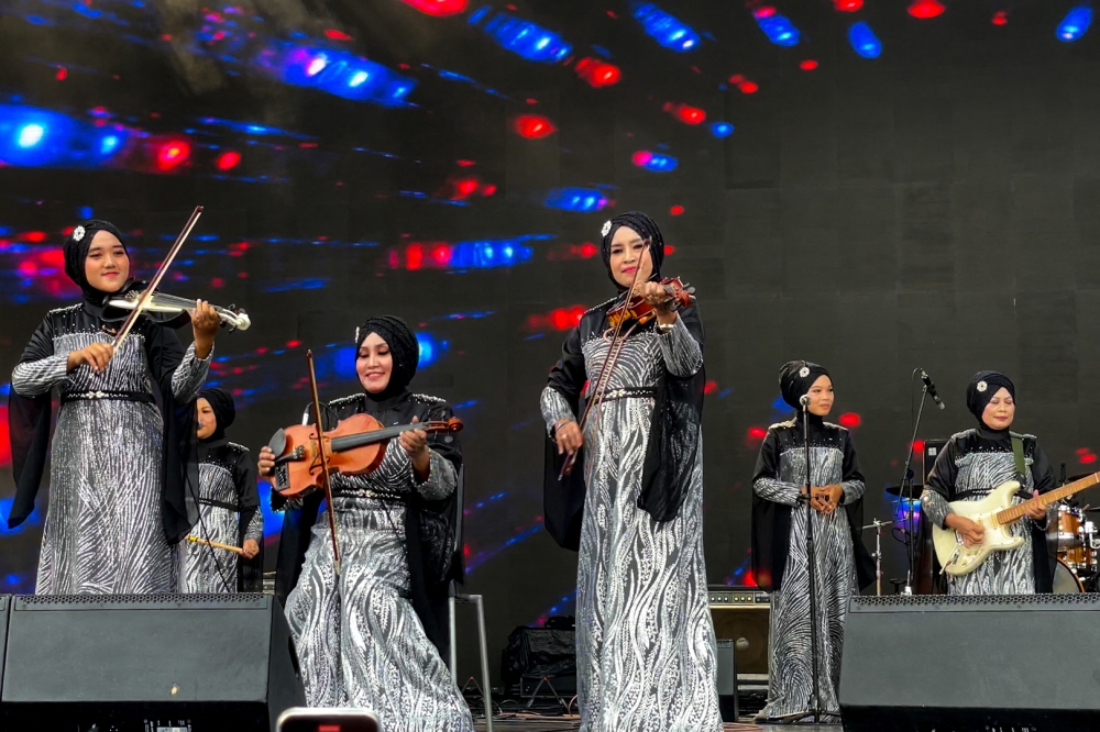 Behind the frontwoman of the all-female Nasida Ria band are her fellow musicians, dressed in silver and black sequined dresses, backing up her velvety vocals with bongos, violins, mandolins, bamboo flutes and tambourines.