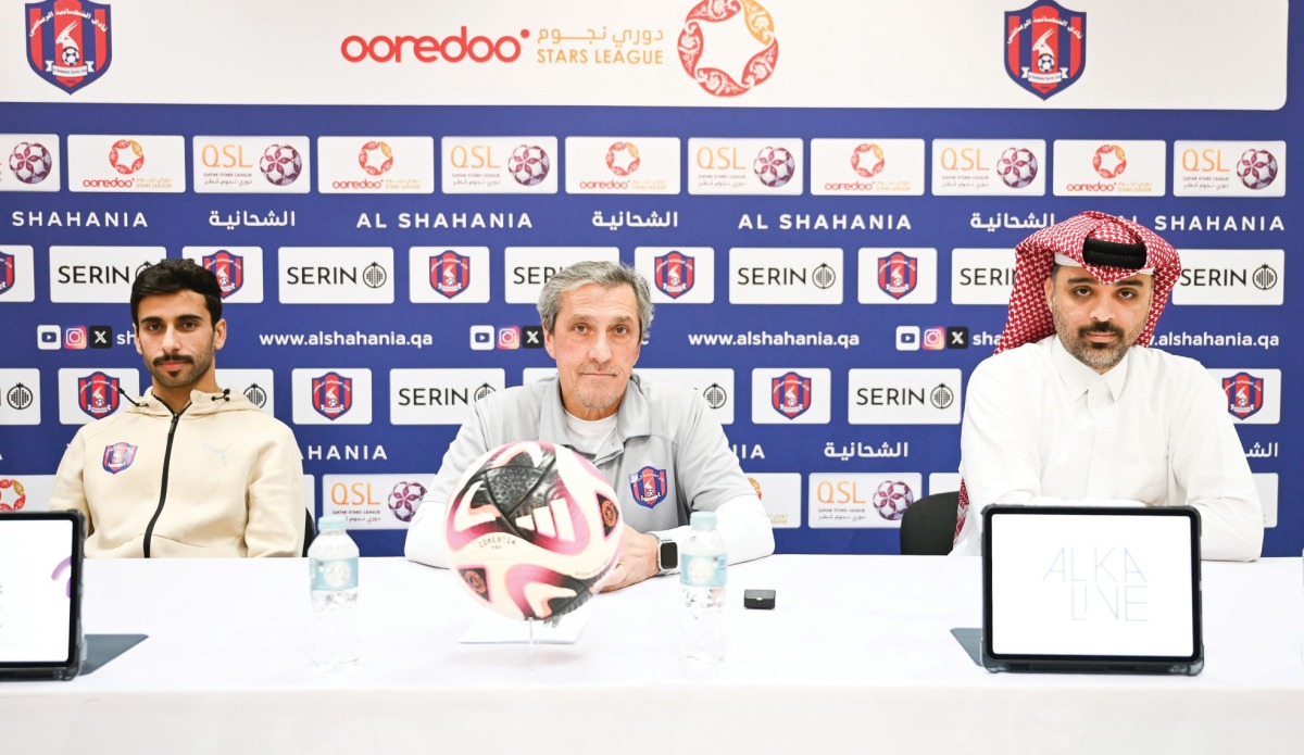 Al Shahania coach Jose Murcia (centre) speaks during the press conference.