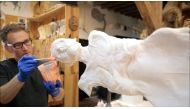 US Paleo artist Gary Staab works on another copy of the Oetzi mummy at the South Tyrol Museum of Archaeology in Bolzano, Italy,...
