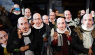 People hold up face masks with William Shakespeare's portrait during celebrations to mark the 400th anniversary of the playwright's death in the city...