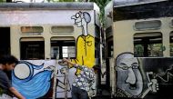 Artists paint tramcars for the two-day festival 'Tram Tales' at a tram depot in Calcutta, India, 07 May 2016. EPA/PIYAL ADHIKARY Kolkata: To...