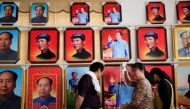 A picture made available on 12 May 2016 shows visitors looking at souvenirs in front of portraits of Mao Zedong at a wholesale...