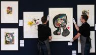 Gallery assistants pose with a work by Spanish artist Joan Miro titled 'Le Fantome de l'atelier' will be auctioned at Christies in London...