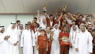 Caption Khaleel Al Jabir, President of Qatar Swimming Association, poses for a picture with swimmers who took part in the 25th GCC Swimming...
