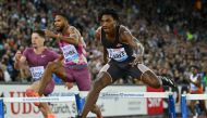 Qatar's Abderrahman Samba (centre) competes in the men’s 400m hurdles at the Diamond League meeting in Zurich, yesterday. Samba celebrated his 29th birthday...