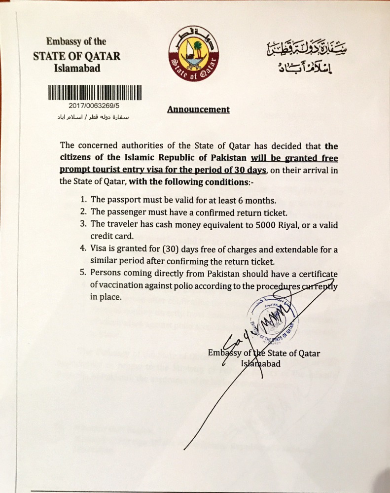 The Qatar embassy in Pakistan posted on their website that Qatar will grant free tourist visa valid for 30 days on their arrival in Qatar provided they meet certain conditions.