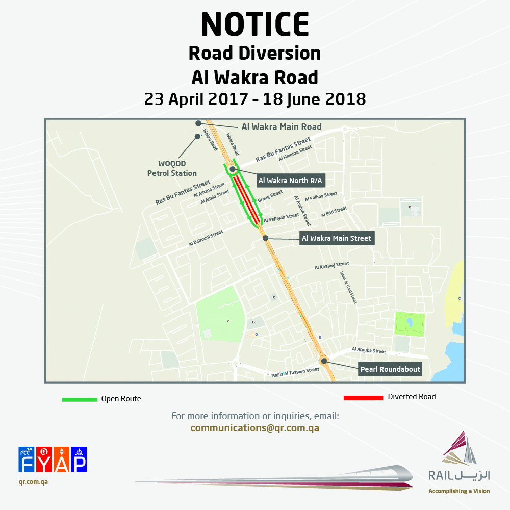 Qatar Rail had announced earlier the diversion of part of Al Wakra Road between Al Wakra Roundabout and the Pearl Roundabout from April 23, 2017 to June 18, 2018. The diversion will take place for the construction of the Al Wakra Highway pedestrian underpass.