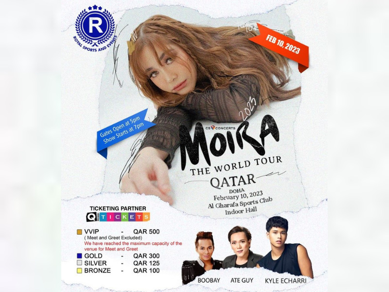 Kabayans, have you booked your ticket to Moira's concert yet? Filipina singer Moira Dela Torre is coming to Qatar to kick off her 2023 world tour! Catch her on February 10 at the Gharafa Sports Club Indoor Hall, together with actor-singer Kyle Echarri, and stand-up comedians Boobay and Ate Guy. Tickets are available via Q-Tickets or contact 6686-2928.