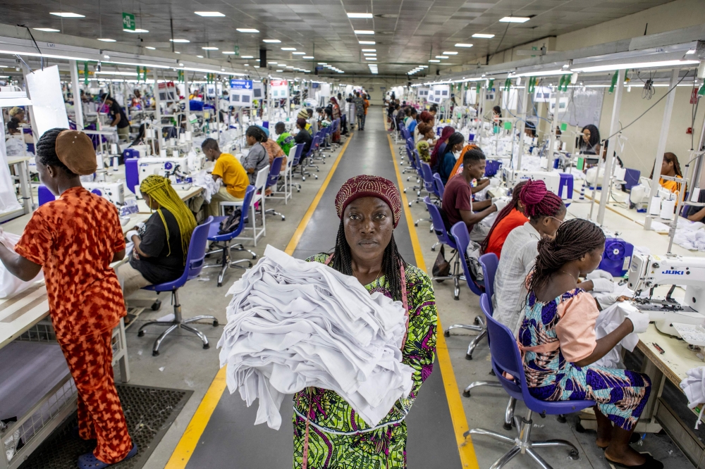 A worker poses for a photograph inside the textile factory in the Glo-Djigbe industrial zone (GDIZ) on January 15, 2025. (Photo by Yanick Folly / AFP)