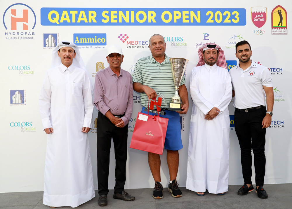 The podium winners of the Qatar Senior Open, pose for a photograph with officials.