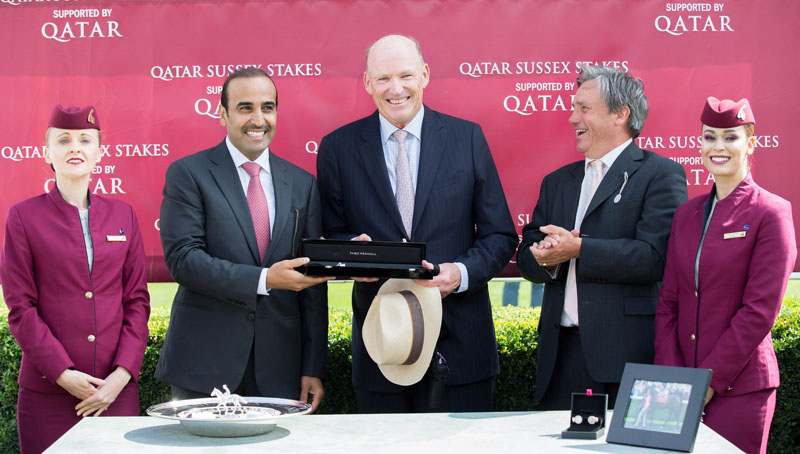 Qatar Racing & Equestrian Club (QREC) Chairman Issa bin Mohammed Al Mohannadi (second, left) presenting the Qatar Sussex Stakes trophy to the trainer of the winning horse Too Darn Hot, John Gosden.