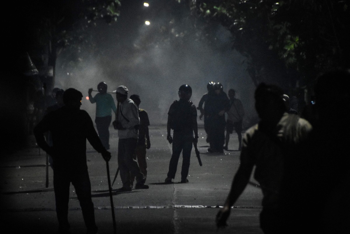 Plainclothes police officers hold sticks as they disperse protesters in front of the Bekasi Metro Police headquarters in Bekasi, West Java on September 1, 2025. Photo by REZAS / AFP