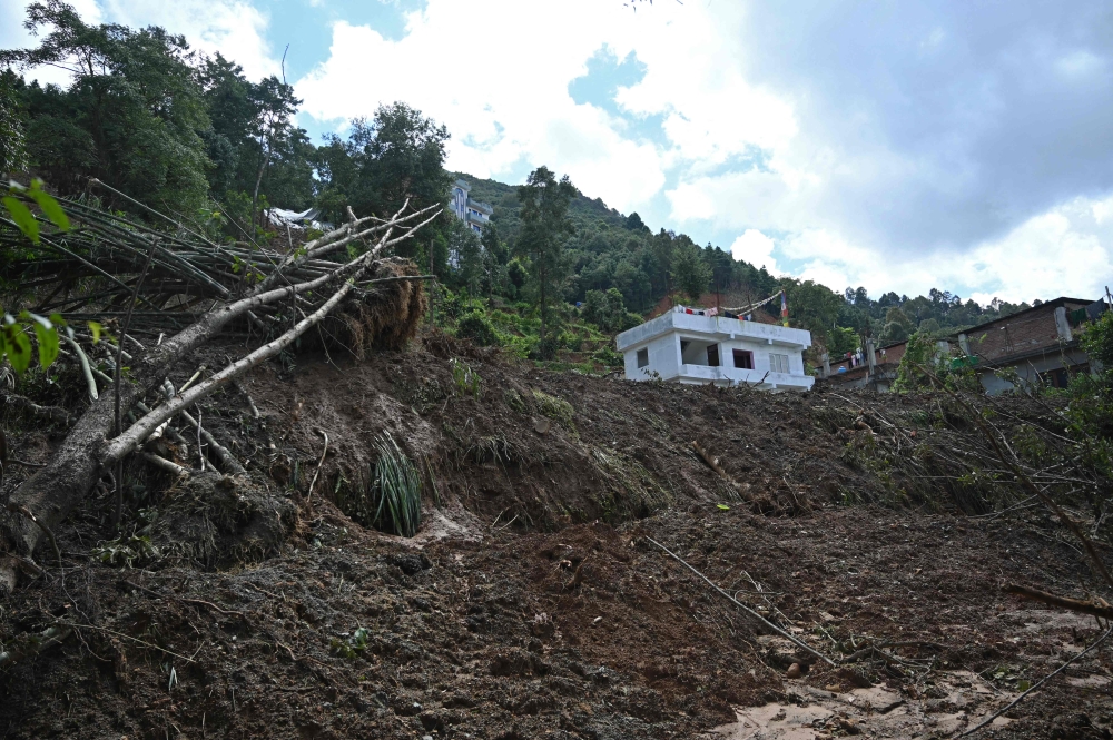 A general view of a landslide-affected village is pictured following heavy rains in Lalitpur district on the outskirts of Kathmandu on October 1, 2024. (Photo by Prakash Mathema / AFP)