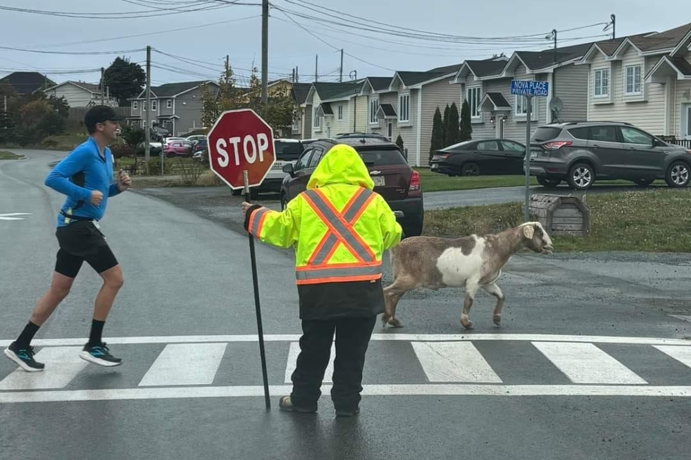 Joshua the goat passes a crosswalk during Conception Bay South's half marathon on Sunday. (Photo by Town of Conception Bay South)