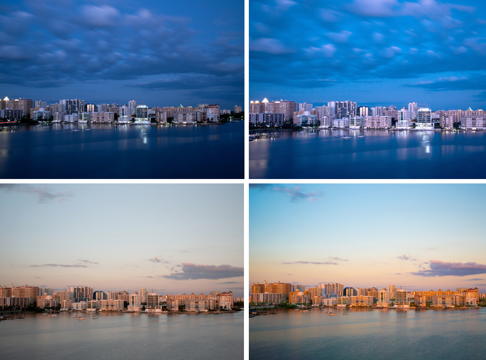 "Before" (left) and "after" shot of Sarasota, Fla., and a nighttime "before" shot of the Sarasota skyline which was a little dark and lacking detail along with an "after" shot. Photo for The Washington Post by Roy Furchgott