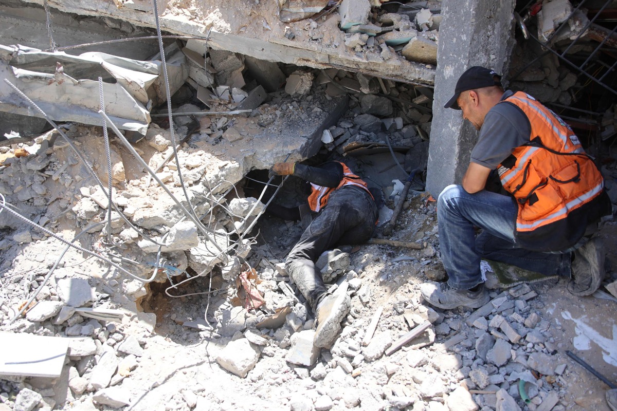Members of the Palestinian civil defence search through the rubble of a building after it was hit in an Israeli strike in the Jabalia refugee camp in the northern gaza on June 1, 2024. (Photo by Omar AL-QATTAA / AFP)