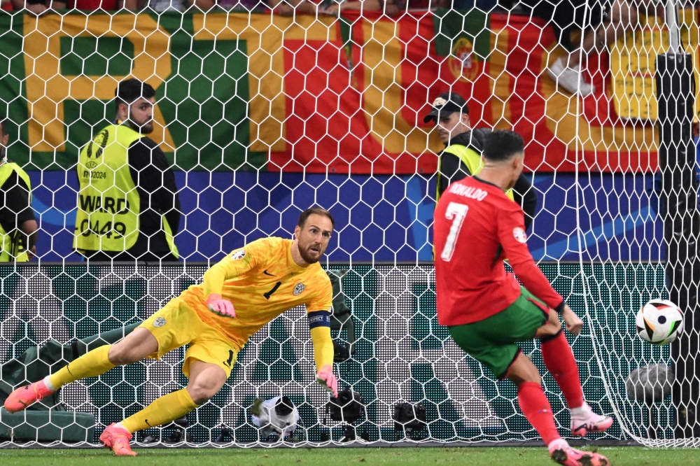 Portugal's forward #07 Cristiano Ronaldo (R) shoots but fails to score from the penalty spot against Slovenia's goalkeeper #01 Jan Oblak during the UEFA Euro 2024 round of 16 football match between Portugal and Slovenia at the Frankfurt Arena in Frankfurt am Main on July 1, 2024. (Photo by Kirill KUDRYAVTSEV / AFP)