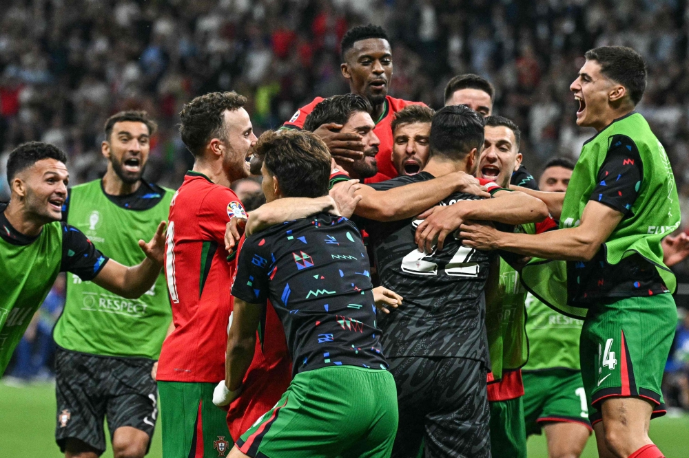 Portugal's players celebrate their win at the end of the UEFA Euro 2024 round of 16 football match between Portugal and Slovenia at the Frankfurt Arena in Frankfurt am Main on July 1, 2024. (Photo by JAVIER SORIANO / AFP)
