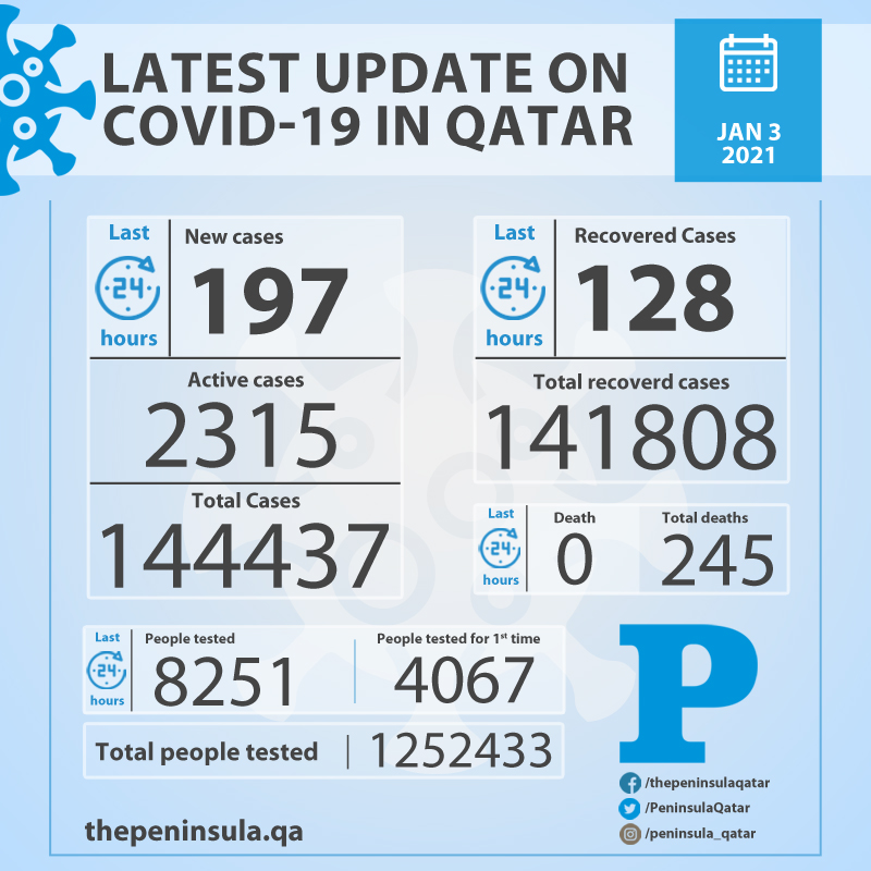 Doha: Ministry of Public Health (MoPH) today recorded 197 new cases of coronavirus (COVID-19) and 128 people recovered from the virus in the last 24 hours, bringing the total number of people recovered in Qatar to 141,808.