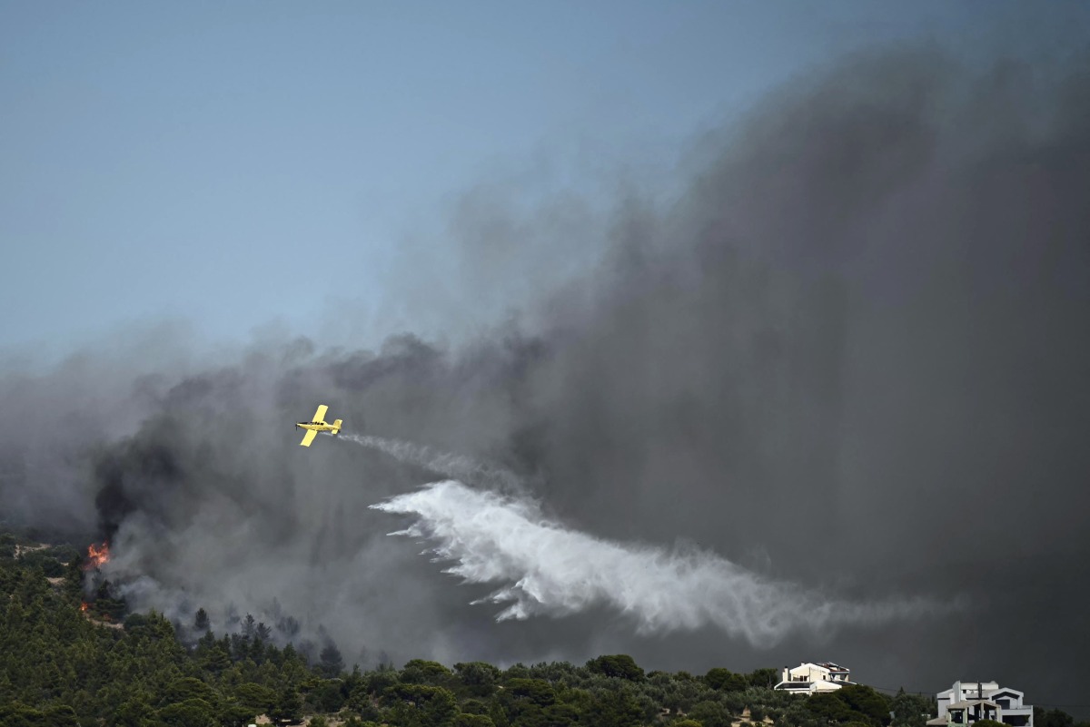 An airplane drops water on a wildfire that broke up in Pikermi, some thirty kilometers east of Athens on July 3, 2025. Photo by Aris MESSINIS / AFP