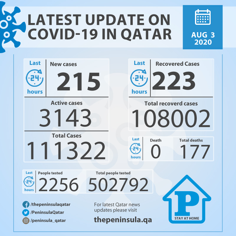 Ministry of Public Health today recorded 215 new cases of coronavirus (COVID-19) and 223 people recovered from the virus in the last 24 hours, bringing the total number of people recovered in Qatar to 108,002.